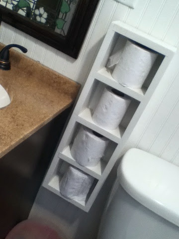 Of course, we started by adding new linoleum, a vanity, and a toilet. I chose to use contrasting dark colors rather than have complete whiteness all around. I had the mirror but it had a light oak frame so I gave it a quick brush over with a thick coat of dark stain. I also decided on the bronze faucet even though the shower has silver. I would love it to match, but I am not changing it out. I can live with it. Just today I added the toilet paper shelf. I have been trying to figure out what to do with this shelf since we moved here. I had no plan to use it in the bathroom but after pouring through pics on Pinterest today I decided to see if it would work. I had thought the shelves would not be deep enough but it seems they will work after all.